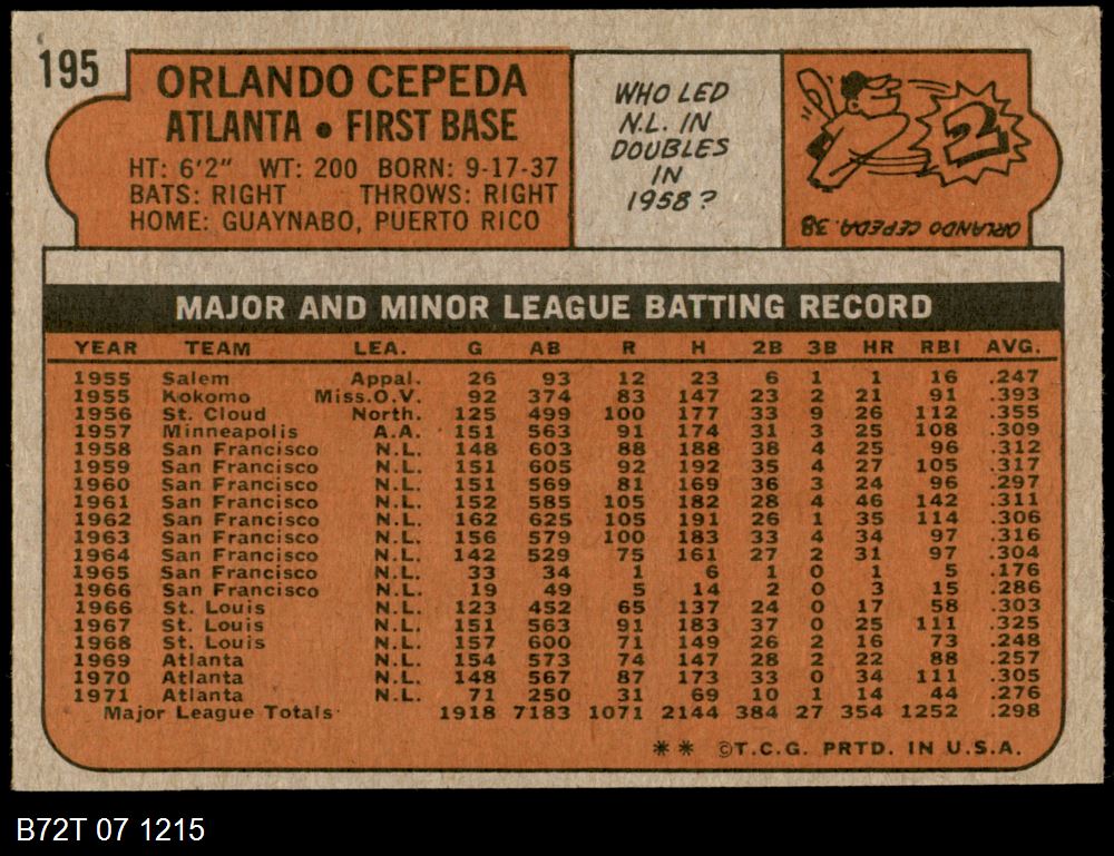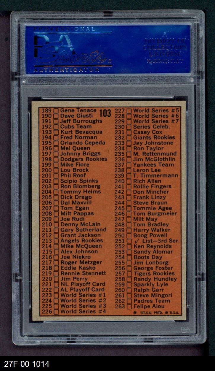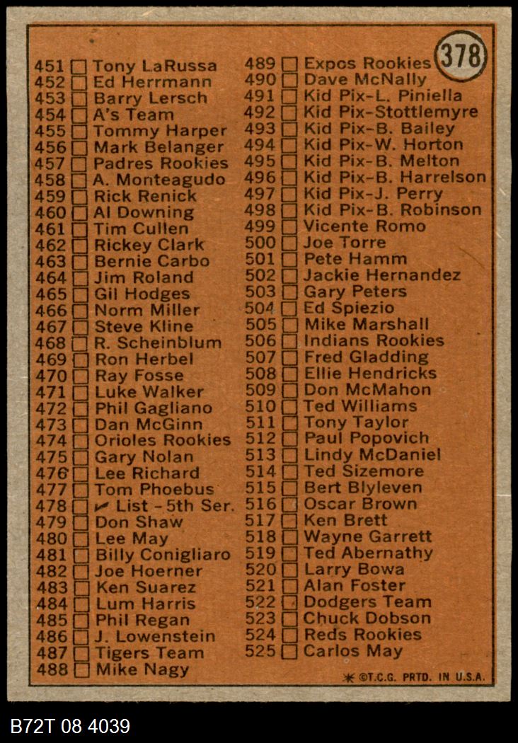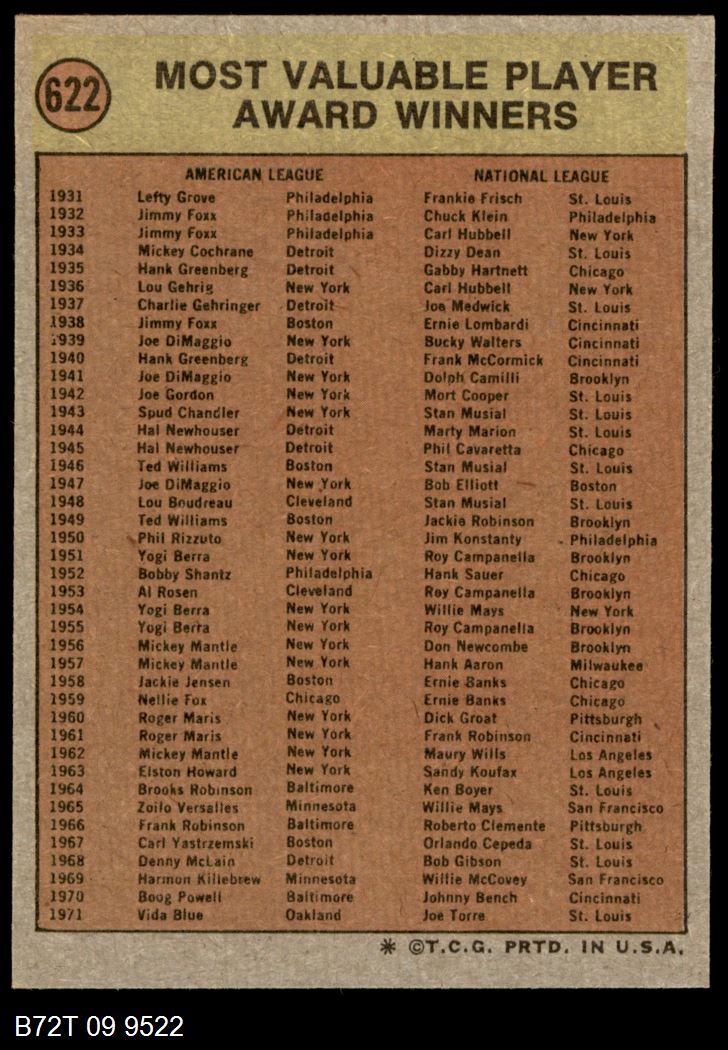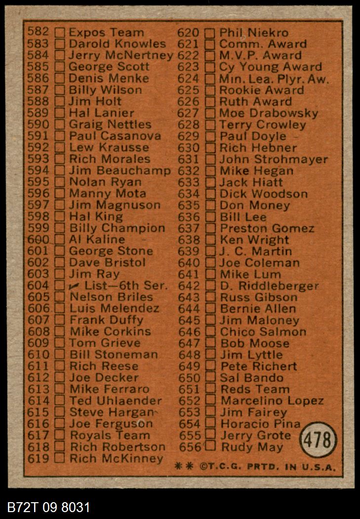 This 1972 Topps set is loaded with hall of famers including:?Yaz, Mays, Killebrew, Fisk, Perez, F. Robinson, Gibson, Morgan, Cepeda, Brock, Clemente, Fingers, Palmer, McCovey, Perry, Aaron, Aparicio, Hunter, Jenkins, Carlton, Bench, Jackson, B. Williams, Seaver, Stargell, Williams MG, B. Robinson, Rose, Marichal, Ryan, Kaline, Niekro, Carew, Carlton, Morgan, and Mazeroski.
