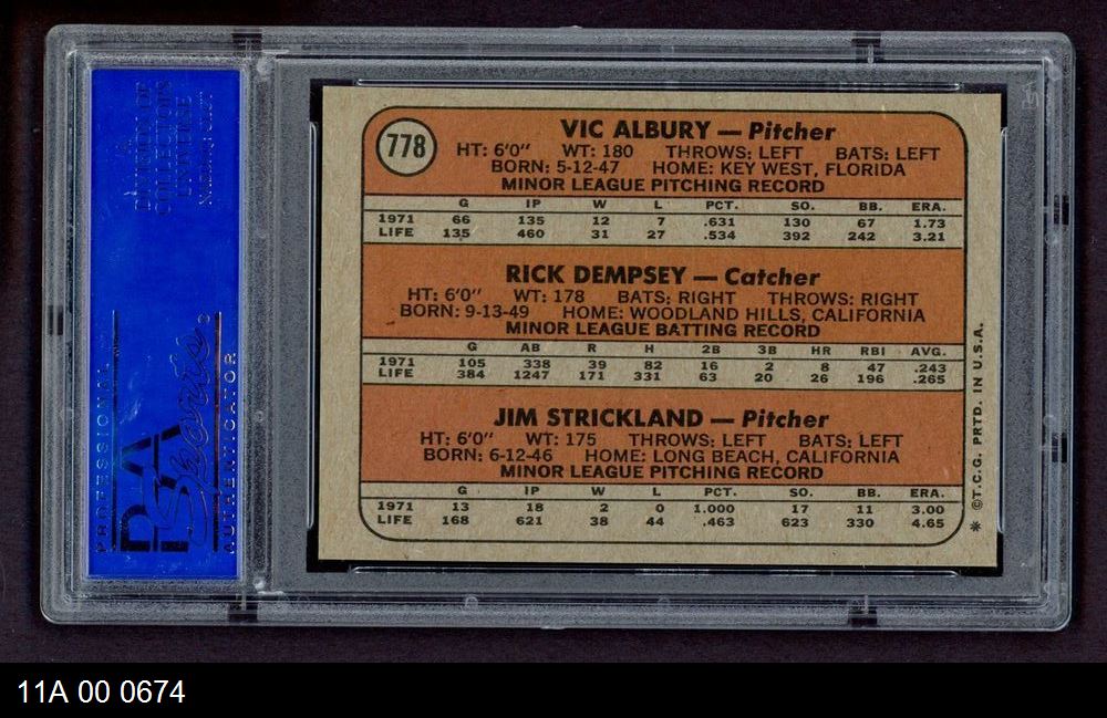 | 1972 Topps #778 - Rick Dempsey / Jim Strickland / Vic Albury Twins Rookies | PSA 8 - NM/MT | Front | Back |