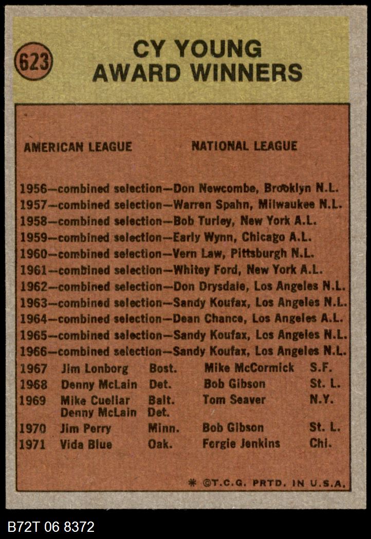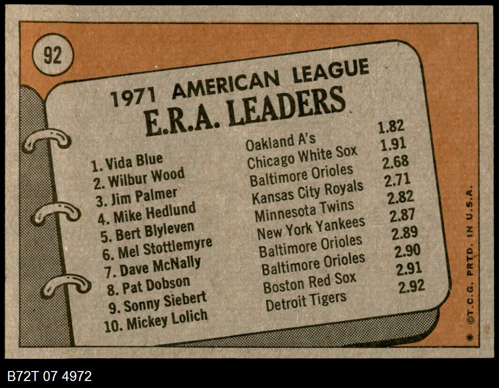 | 1972 Topps #92 - Vida Blue / Jim Palmer / Wilbur Wood AL ERA Leaders | 6.5 - EX/MT+ | Front | Back |