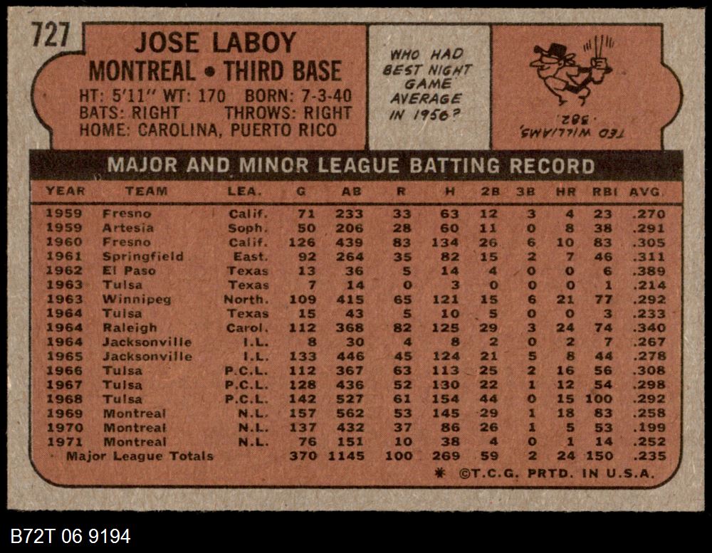 | 1972 Topps #727 Jose Laboy | 7.5 - NM+ | Front | Back |