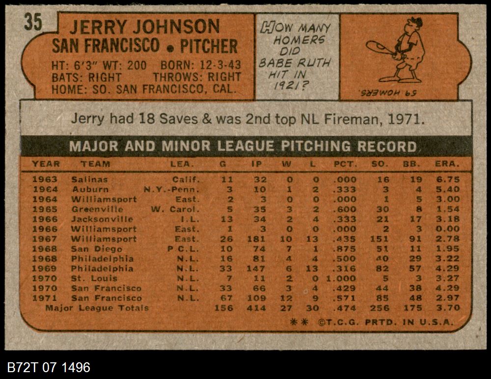 | 1972 Topps #35 Jerry Johnson | 8 - NM/MT | Front | Back |