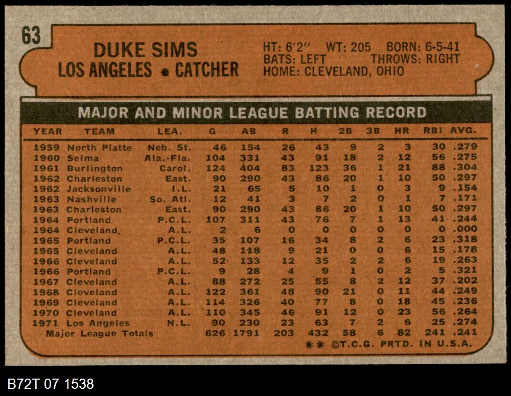 | 1972 Topps #63 Duke Sims | 8 - NM/MT | Front | Back |