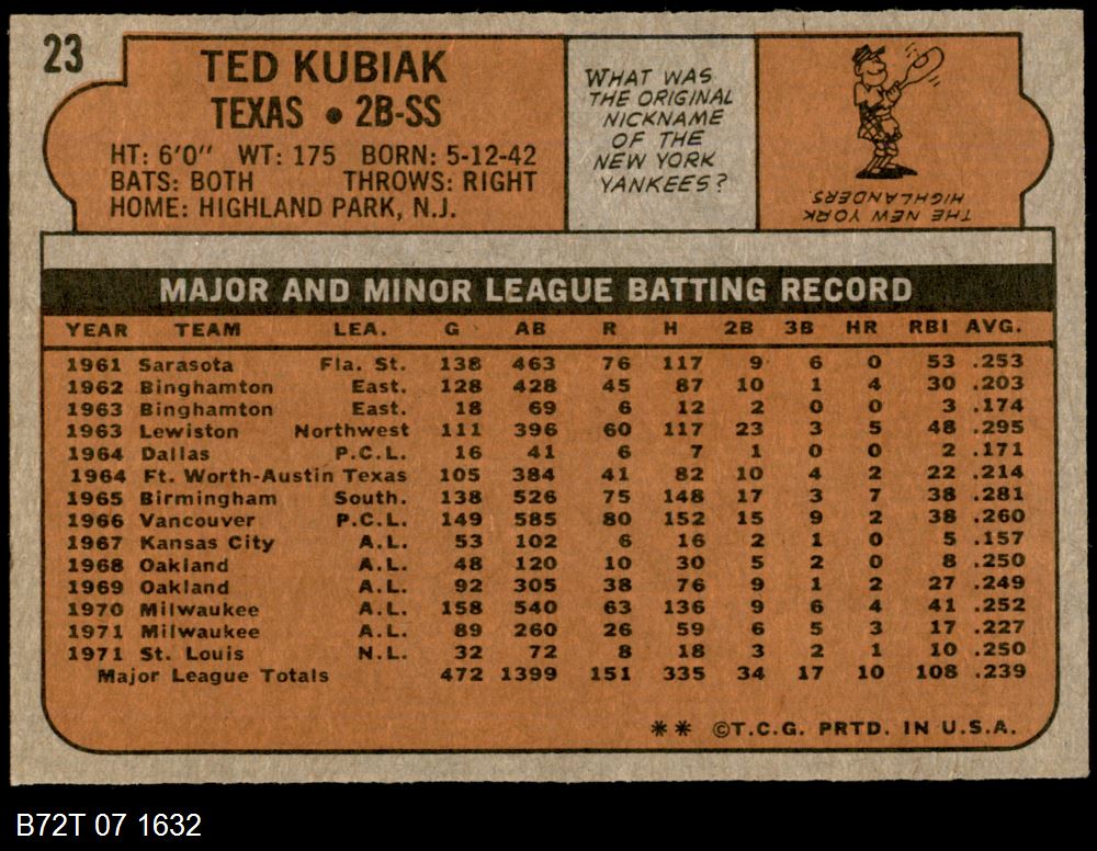 | 1972 Topps #23 Ted Kubiak | 7 - NM | Front | Back |