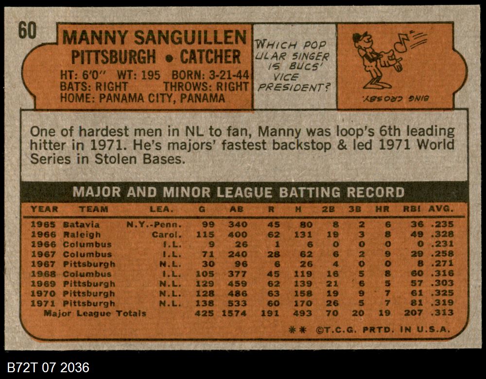 | 1972 Topps #60 Manny Sanguillen | 8 - NM/MT | Front | Back |
