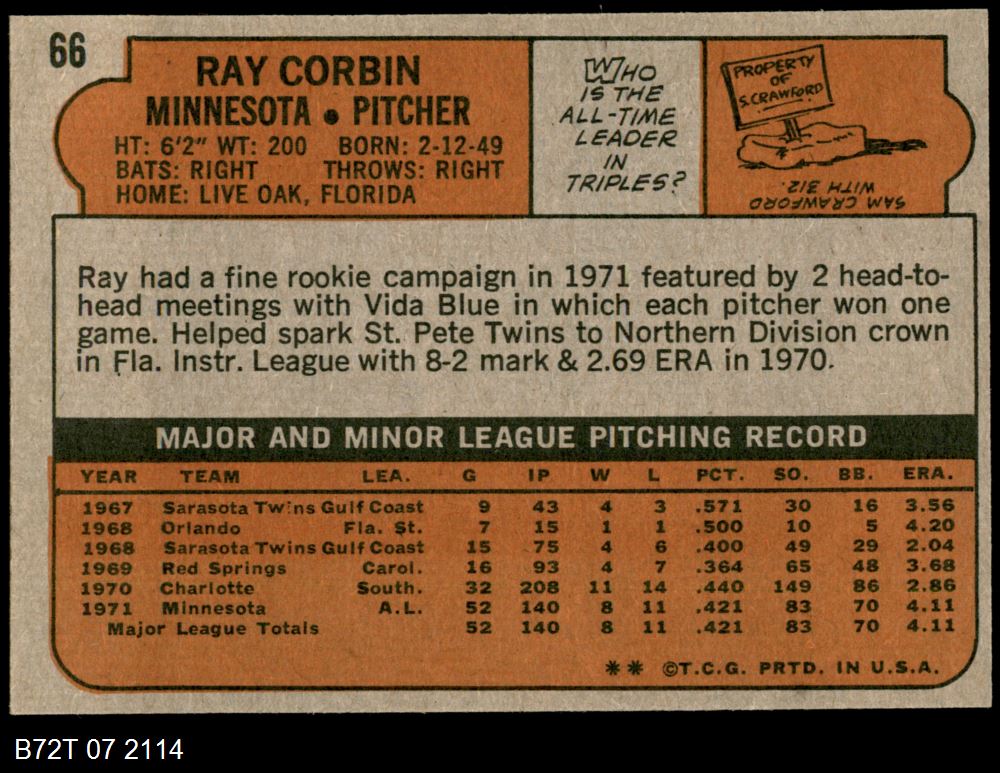 | 1972 Topps #66 Ray Corbin | 8 - NM/MT | Front | Back |