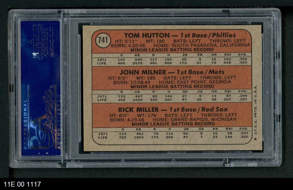 | 1972 Topps #741 - Tom Hutton / Rick Miller / John Milner AL - NL Rookies | PSA 8 - NM/MT | Front | Back |