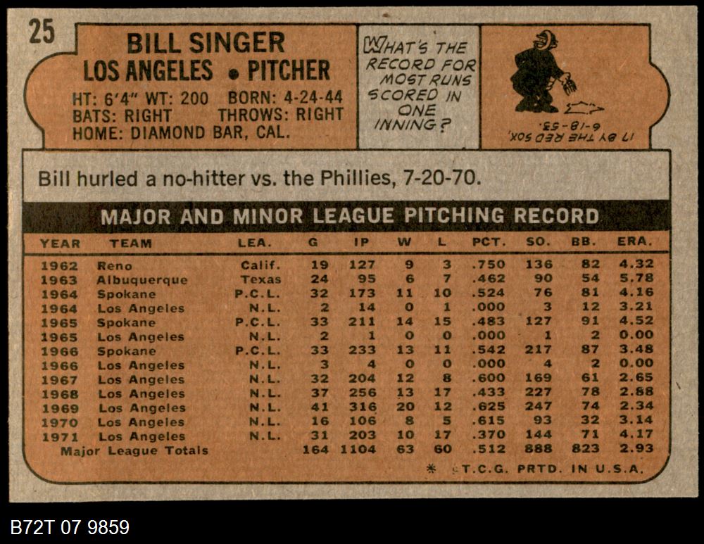 | 1972 Topps #25 Bill Singer | 7 - NM | Front | Back |