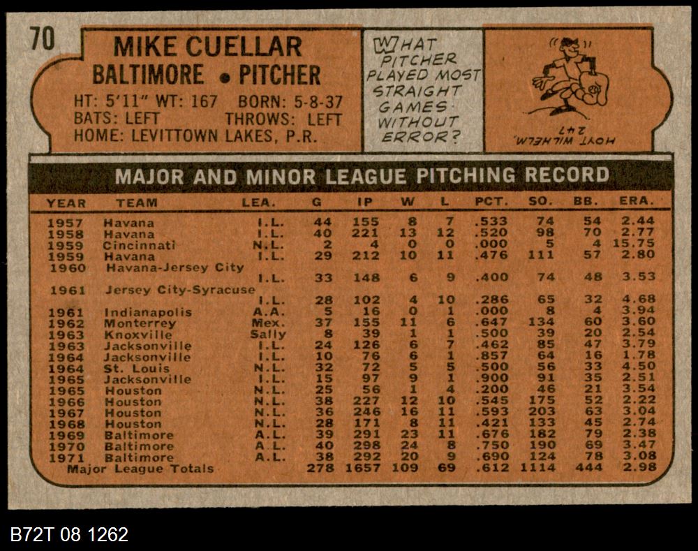 | 1972 Topps #70 Mike Cuellar | 7 - NM | Front | Back |
