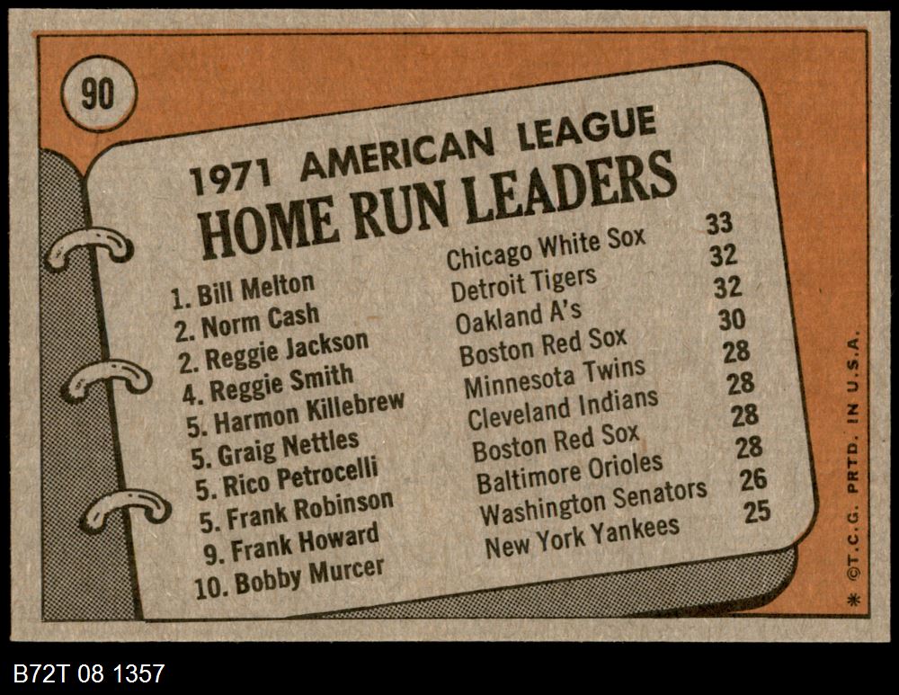 | 1972 Topps #90 - Reggie Jackson / Norm Cash / Bill Melton AL HR Leaders | 7 - NM | Front | Back |