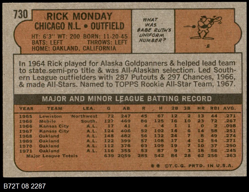 | 1972 Topps #730 Rick Monday | 8 - NM/MT | Front | Back |