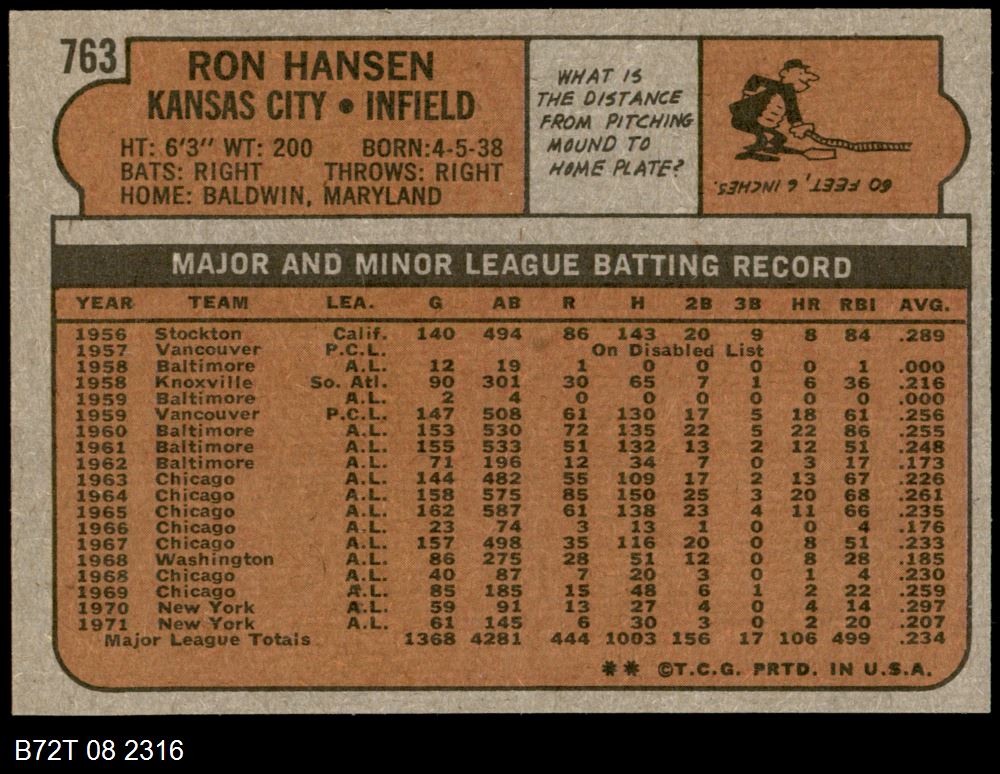 | 1972 Topps #763 Ron Hansen | 8 - NM/MT | Front | Back |