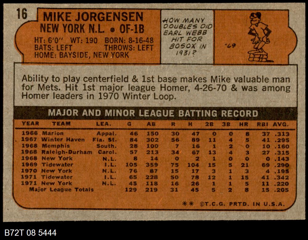 | 1972 Topps #16 Mike Jorgensen | 7 - NM | Front | Back |