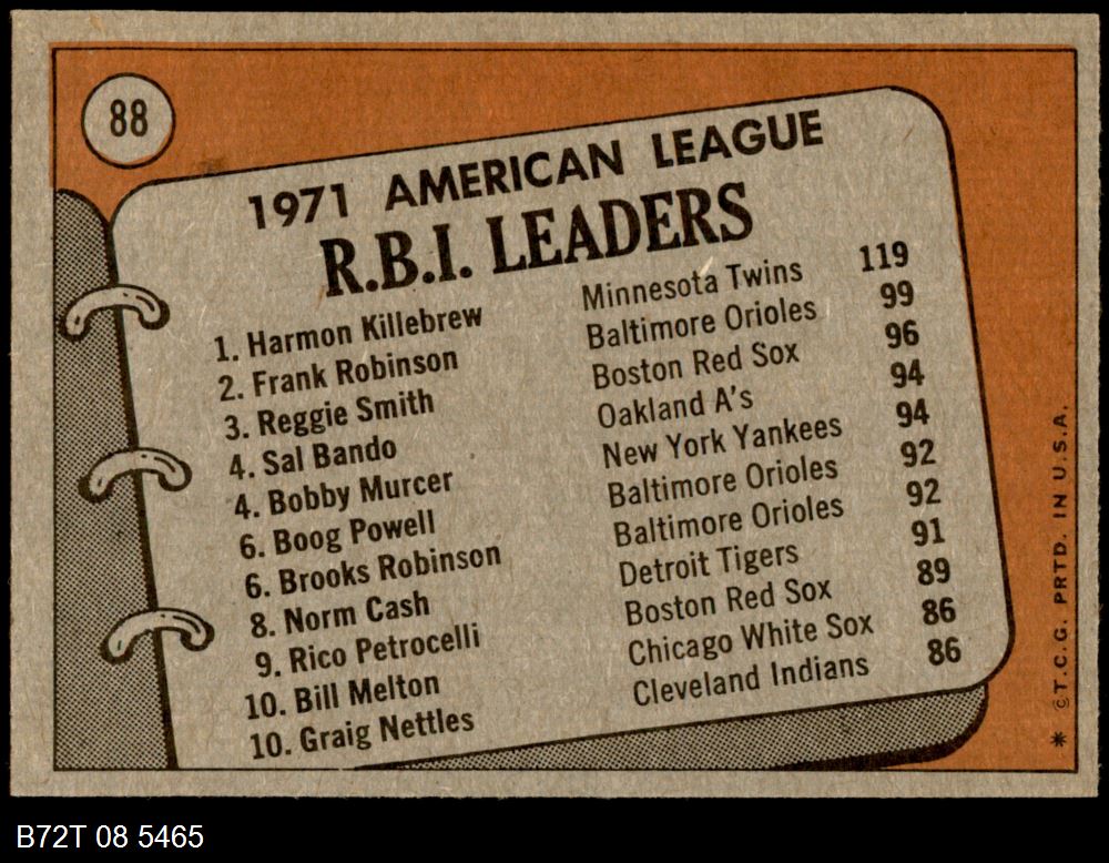 | 1972 Topps #88 - Harmon Killebrew / Frank Robinson / Reggie Smith AL RBI Leaders | 7 - NM | Front | Back |