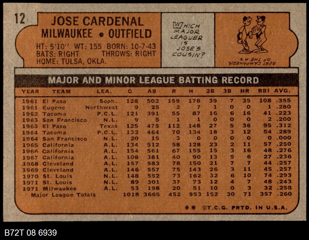 | 1972 Topps #12 Jose Cardenal | 7 - NM | Front | Back |