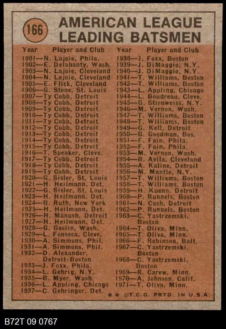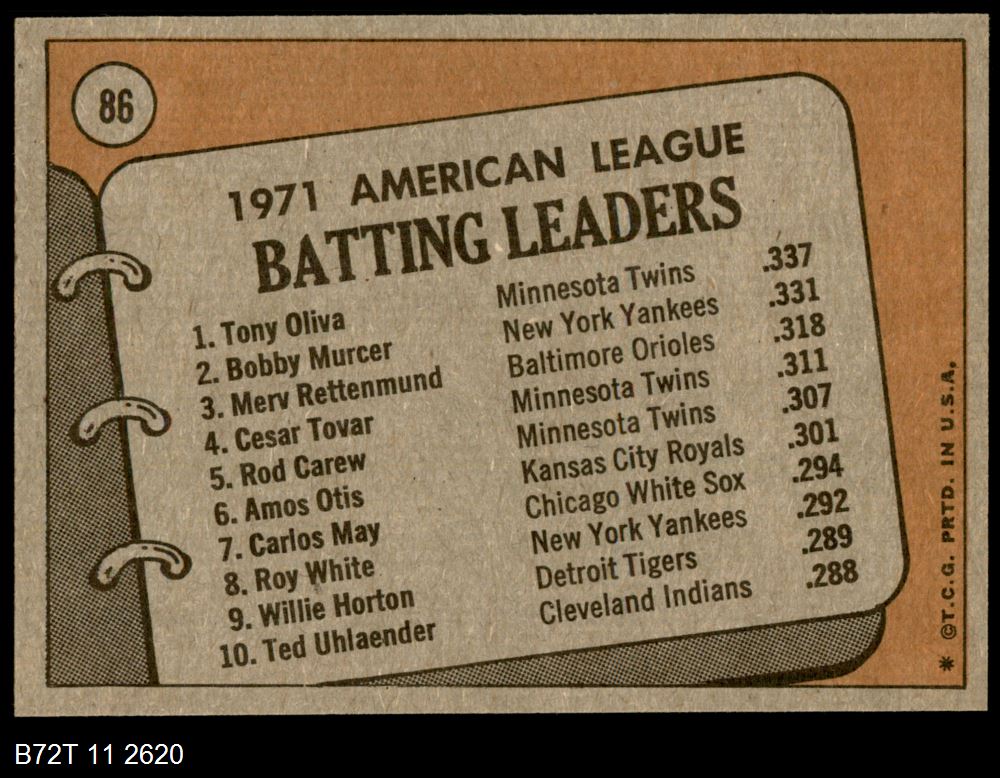 | 1972 Topps #86 - Bobby Murcer / Tony Oliva / Merv Rettenmund AL Batting Leaders | 8 - NM/MT | Front | Back |