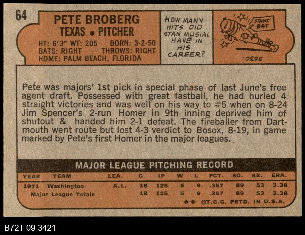 | 1972 Topps #64 Pete Broberg | 7 - NM | Front | Back |