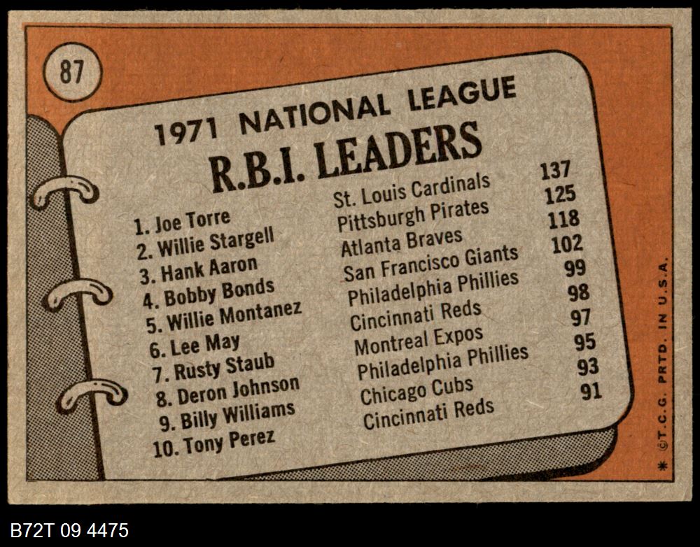 | 1972 Topps #87 - Hank Aaron / Willie Stargell / Joe Torre NL RBI Leaders | 6.5 - EX/MT+ | Front | Back |