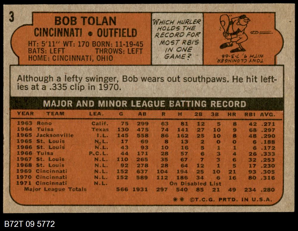 | 1972 Topps #3 Bobby Tolan | 8 - NM/MT | Front | Back |