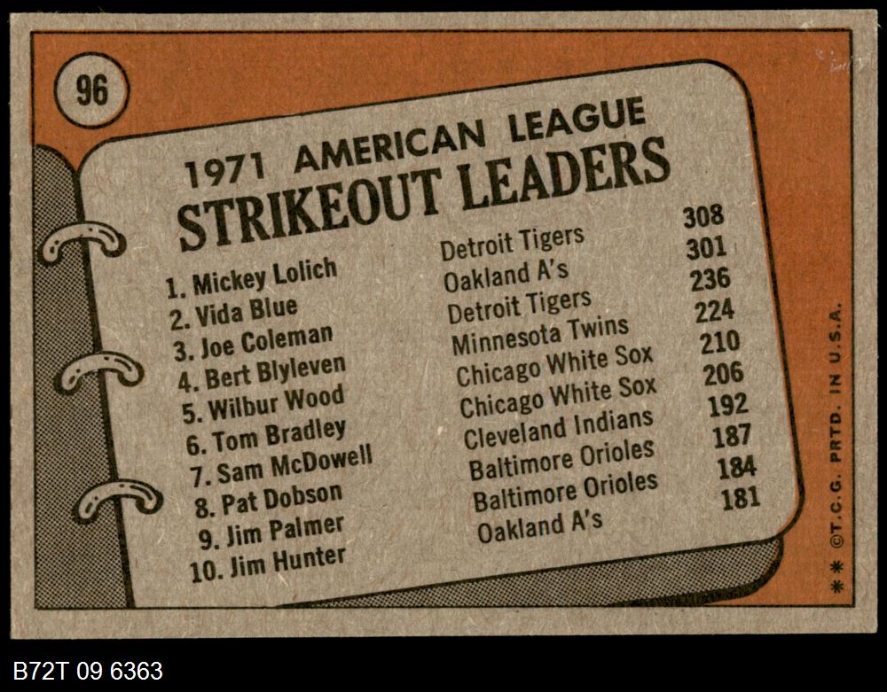 | 1972 Topps #96 - Vida Blue / Joe Coleman / Mickey Lolich AL Strikeout Leaders | 6 - EX/MT | Front | Back |