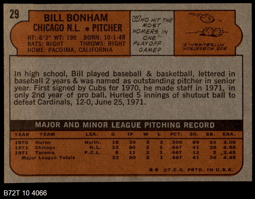 | 1972 Topps #29 YLW Bill Bonham | 7 - NM | Front | Back |