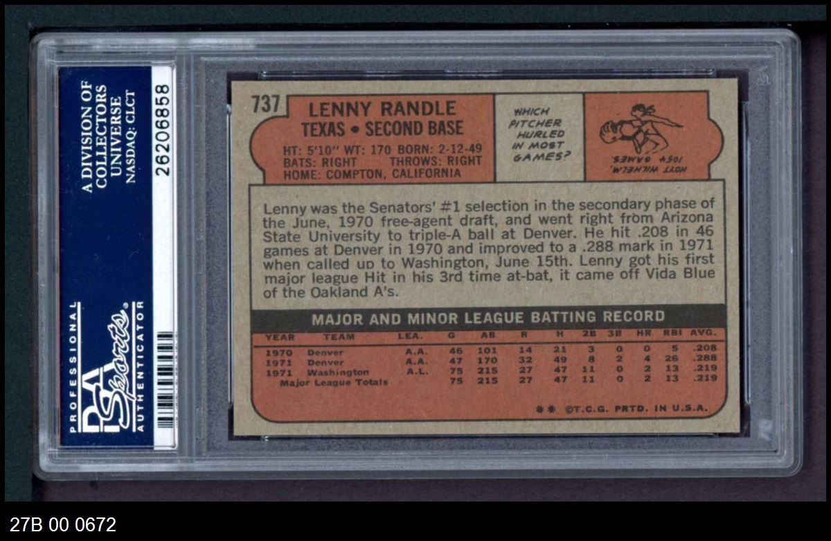 | 1972 Topps #737 Len Randle | PSA 8 - NM/MT | Front | Back |