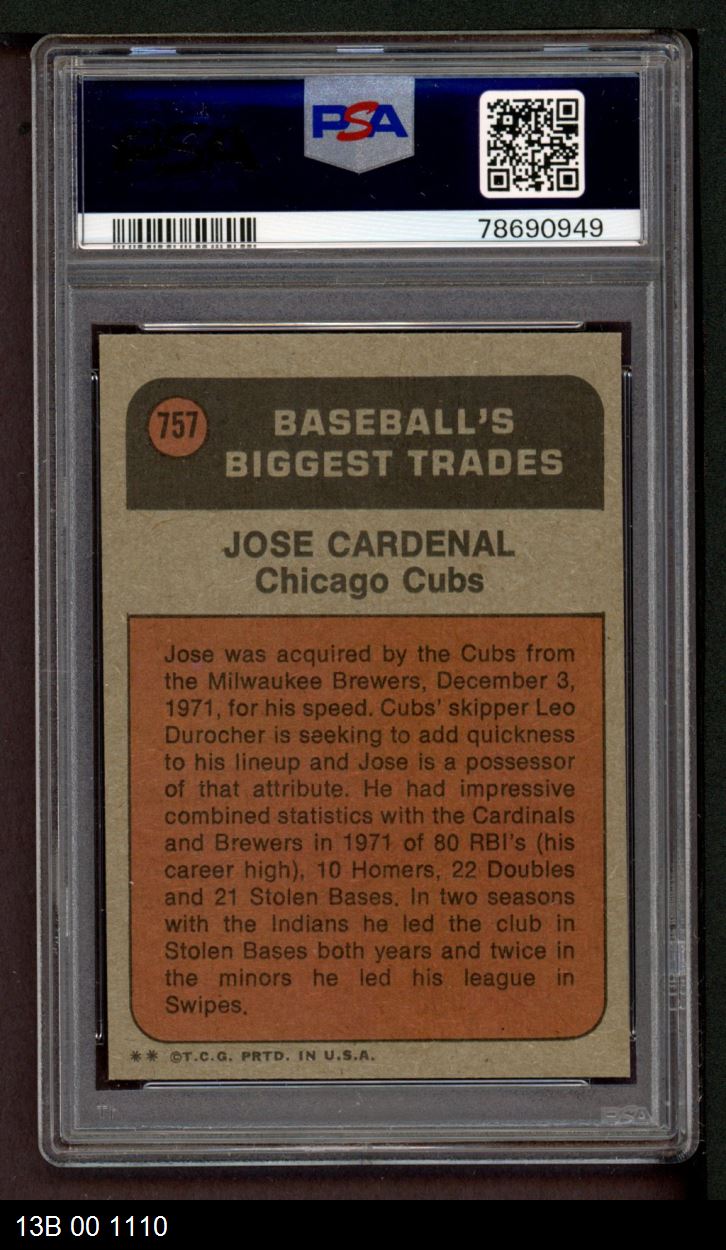 | 1972 Topps #757 - Jose Cardenal Traded | PSA 8 - NM/MT | Front | Back |