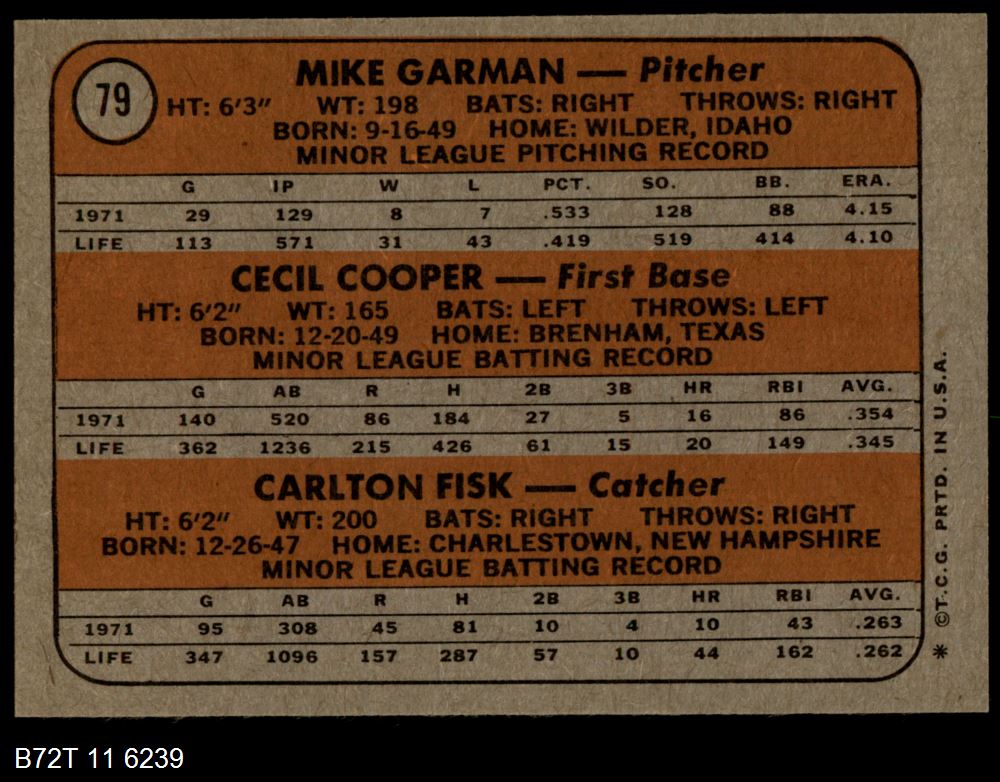 | 1972 Topps #79 - Carlton Fisk / Cecil Cooper / Mike Garman Red Sox Rookies | 6 - EX/MT | Front | Back |