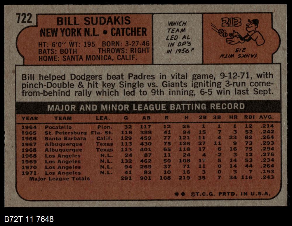 | 1972 Topps #722 Bill Sudakis | 8 - NM/MT | Front | Back |