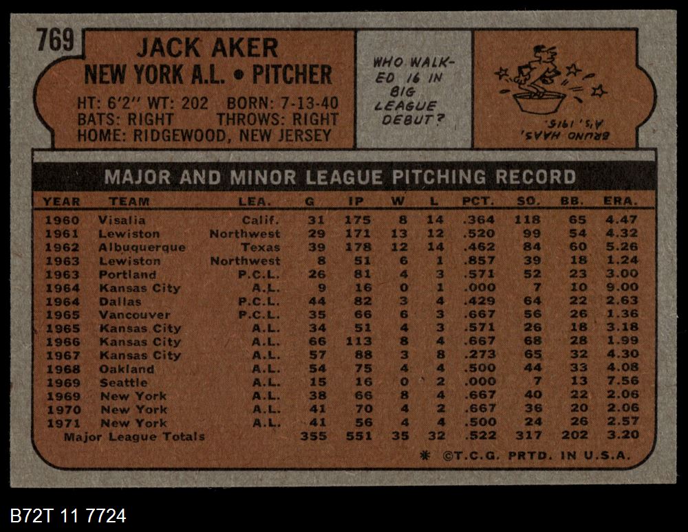| 1972 Topps #769 Jack Aker | 8 - NM/MT | Front | Back |