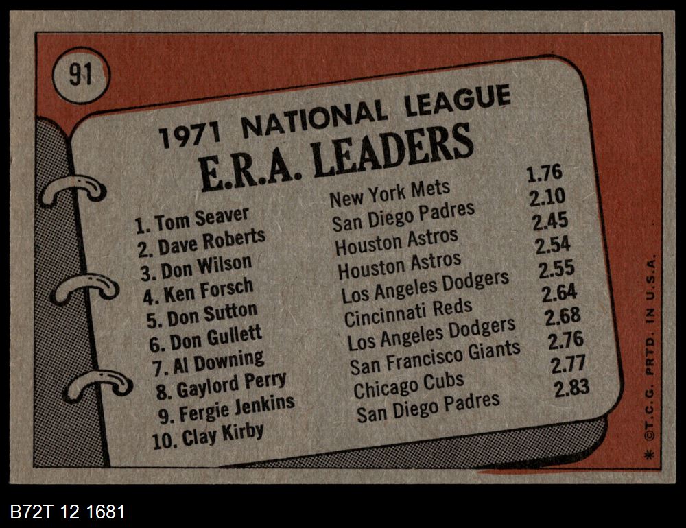 | 1972 Topps #91 - Tom Seaver / Dave Roberts / Don Wilson NL ERA Leaders | 8 - NM/MT | Front | Back |