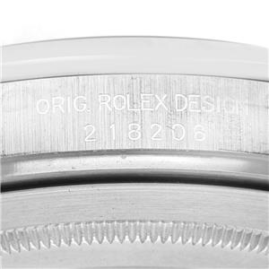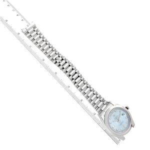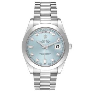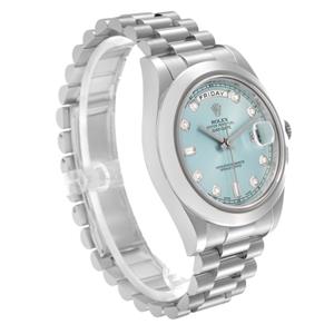 Ice blue dial with original Rolex factory diamond hour markers and platinum baton hands. Sweeping centre seconds. Outer minute and 1/2 seconds divisions, aperture for day of the week at 12 o'clock, aperture for date at 3 o'clock.