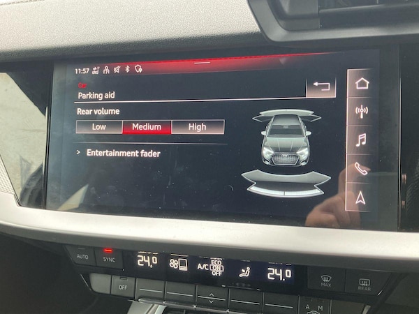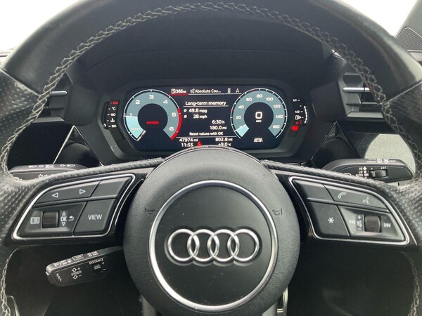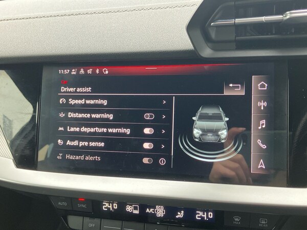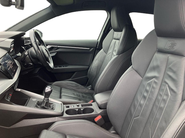 ..Audi connect emergency call and service, Audi drive select (Auto, Comfort, Dynamic and Individual), Audi smartphone interface, Audi Virtual Cockpit - 10.25'' digital and colour instrument cluster, Automatic start/stop system with recuperation, Bluetooth interface, Collision avoidance assistant, Electromechanical power speed sensitive steering, Lane departure warning system, MMI Navigation Plus with high resolution 10.1'' colour touch screen display, Service indicator, Trip computer, Voice control system with natural language interaction, 2xUSB-C connection with data and charging functions, 6 passive loudspeakers, DAB Digital radio, 3rd brake light, Acoustic glass windscreen, Aluminium window trim, Auto dimming frameless rear view mirror, Electrically adjustable/heated/folding/auto dimming door mirrors with integrated LED indications + kerb view function for passenger side, Front electric windows, Illuminated aluminium inserts front door sills with S logo, LED daytime running lights, LED headlights with LED rear lights and dynamic rear indicators, Light and rain sensors, Privacy glass - dark tinted rear window, rear door and side windows, Rear electric windows, Rear side air outlets in grained matt black, Rear side wing doors, Rear wiper, S line bumpers, S roof spoiler, 12V socket and storage compartment in front centre console, 3 seat bench in 2nd row, 40/20/40 split folding rear seat bench with cupholder, Black cloth headlining, Dual zone electronic climate control, Front and rear centre armrest in leather, Front and rear headrests, Front/rear floor mats, Height and reach adjustable steering wheel, Interior lighting - glove compartment light and right hand side, Luggage compartment floor covering, Manual boot compartment lid, Manually adjustable front seats, Seat side bolsters, Single front passenger seat, Stainless steel pedals and front footrest in black, Twin leather upholstery with front sports seats S embossed logo, Aluminium interior elements pack - A3 Sportback, S line styling pack - A3 Sportback, 3x3 point rear seat belts, Driver and front passenger airbag with passenger airbag deactivation, Electronic Stabilisation Control (ESC) including ABS, ASR and EDL, First aid kit with warning triangle and 2 safety vests, Front side airbags with head airbags and interaction airbag, Hill hold assist, Pre-sense front with pedestrian and cyclist detection, Seatbelt monitoring, Tyre pressure loss indicator, Anti theft alarm, Anti-theft wheel bolts,