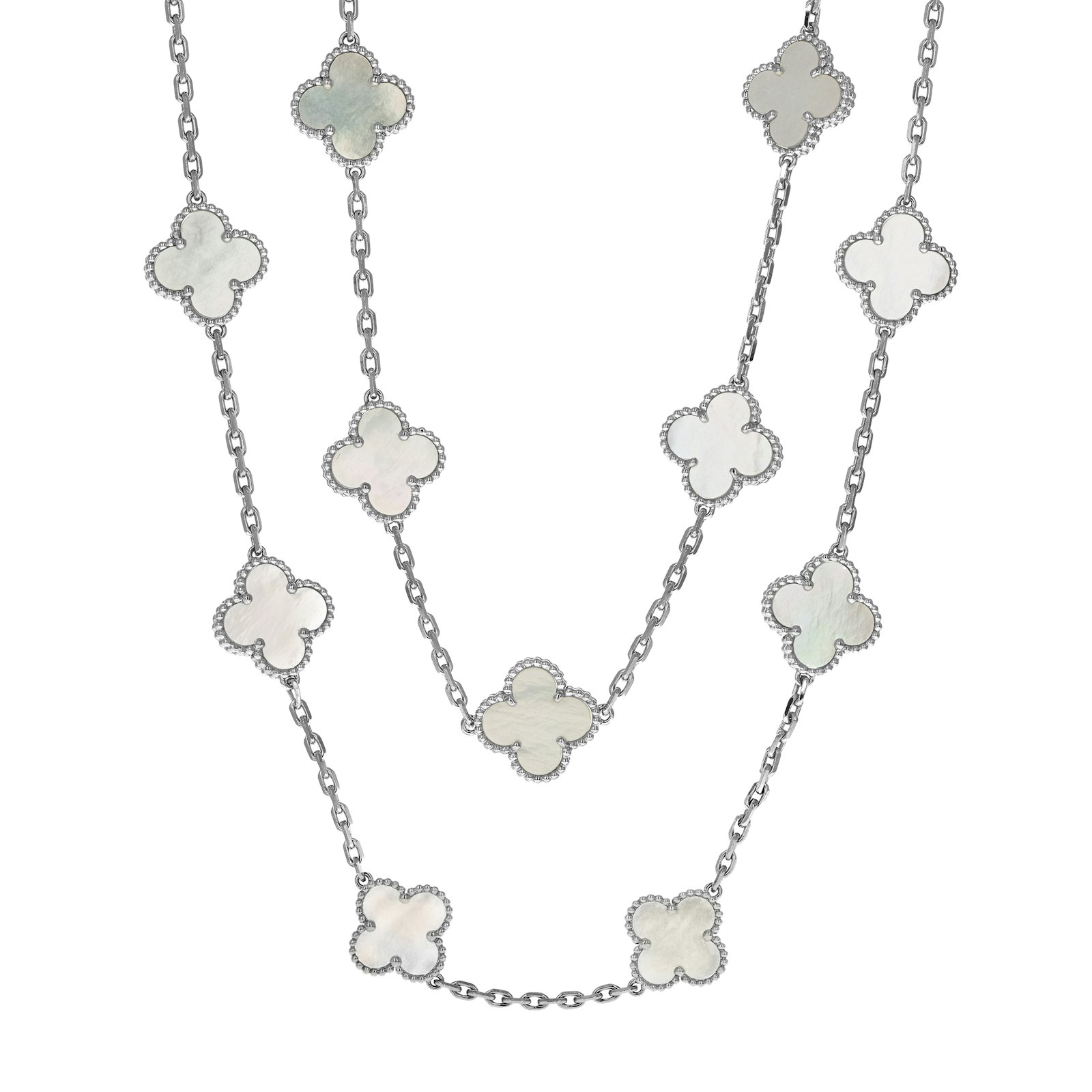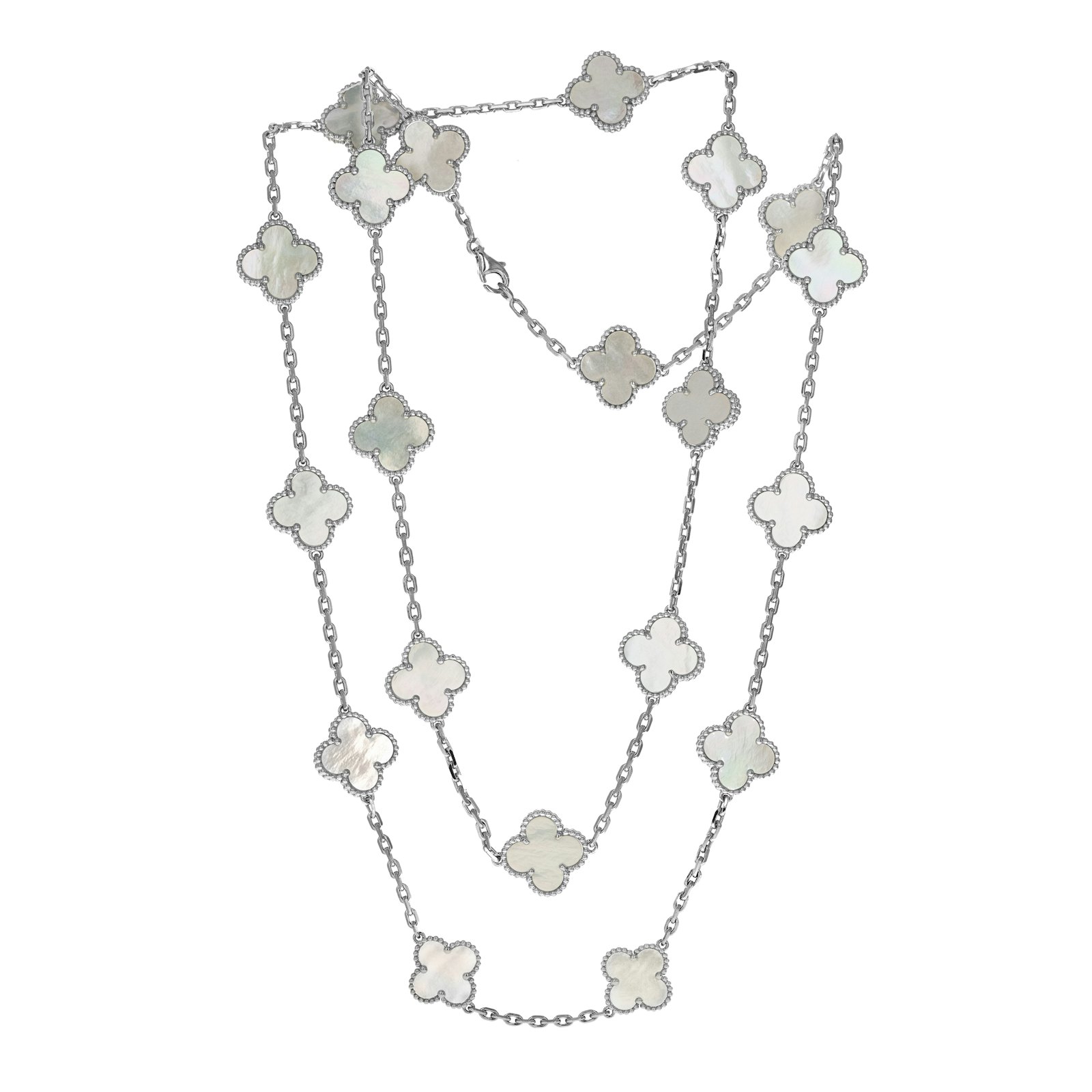 A pre-owned Van Cleef & Arpels 18kt white gold and mother-of-pearl long necklace from the Vintage Alhambra Collection. The necklace features a 32.5 inch long cable chain with a lobster clasp and 20 signature motifs evenly spaced-out along the entire necklace. The motifs feature double sided, white mother-of-pearl with a milgrain edge. The necklace comes with the original Van Cleef & Arpels paperwork.