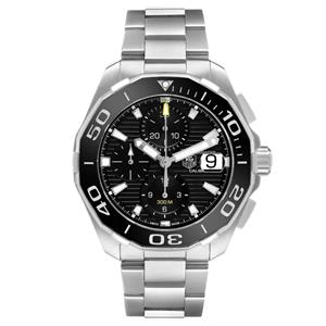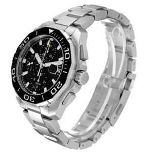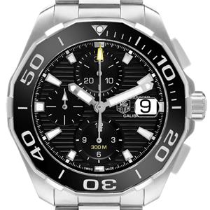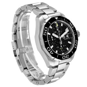 Black dial with luminous hands and index hour markers. Minute markers around the outer rim. Date window at the 3 o'clock position. Three chronograph subdials -- 60 second, 30 minute and 12 hours.
