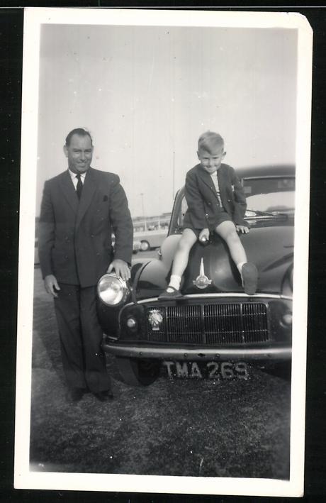 Fotografie Auto, Knabe auf PKW Motorhaube sitzend, Kennzeichen TMA 269