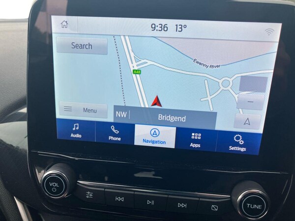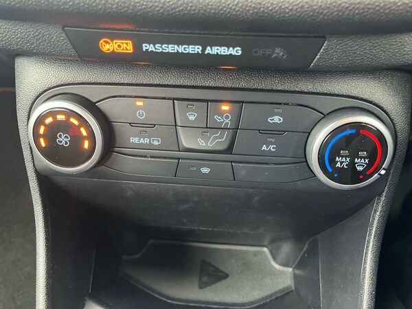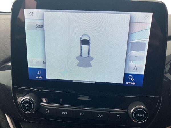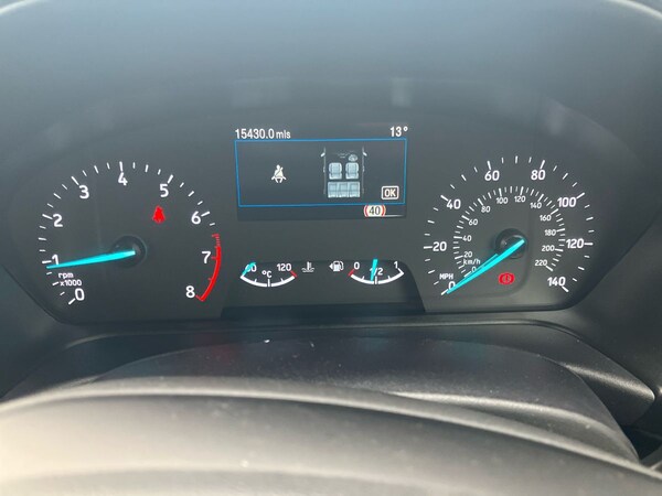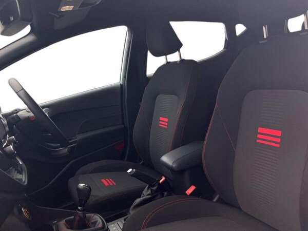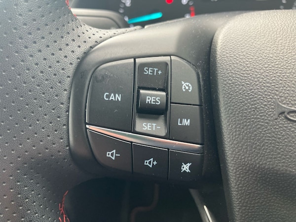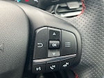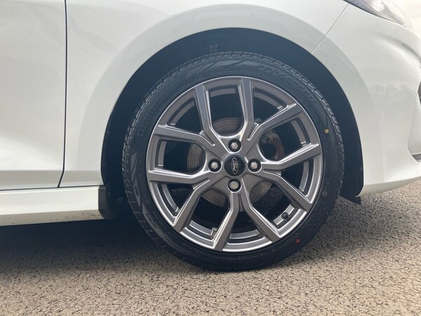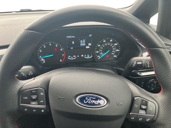 ..4.2'' Colour TFT Ice blue illumination analogue cluster, Driver alert system, Electric power steering, Ford easy fuel, Lane keep assist, Lane keeping aid, Rear parking distance sensors, Selectable drive modes (Normal, Sport, Track), Trip computer, Sports suspension, 3rd brake light, Auto high beam, Automatic headlights, Body colour bumpers, Body colour large rear spoiler, Body coloured electrically operated with side indicators, Electric front windows/one touch facility, Electric rear windows, Quickclear heated windscreen, Rain sensing wipers and auto dimming rear view mirror, Rear privacy glass, Rear side wing doors, Rear wiper, Unique ST-Line grille, full bodystyling kit and large body coloured rear spoiler, 3 rear headrests, 3 seat bench in 2nd row, Adjustable head restraints, Black headlining, Centre console with opening armrest, 2x cupholders, 12v and USB, Cloth upholstery with red stitching, Leather gear knob, Manual 2 way passenger seat adjust, Manual 4-way driver seat adjust, Manual air conditioning, Premium floor mats, Sensico wrapped steering wheel, Single front passenger seat, 3 point seatbelts on all rear seats, Electronic stability control with hill start assist, Front and rear seat belt warning, Manual child lock in rear doors, Tyre pressure monitoring system, Keyless start with 'Ford Power' starter button, MyKey system, Remote central locking, Thatcham alarm with power door dead locks, 17'' 5x2 spoke alloy wheels with rock metallic finish