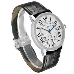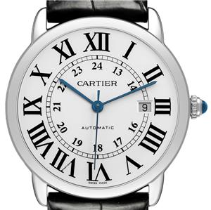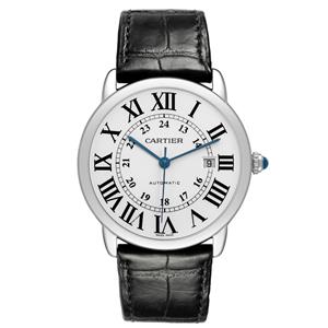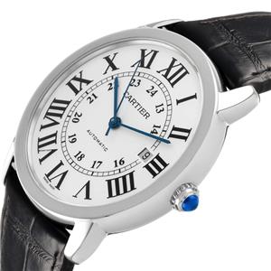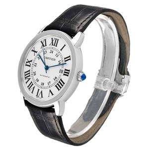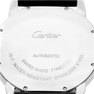 Silvered opaline dial with black Roman numerals. Blued steel hands. Secret Cartier signature at VII. Date calendar window at 3. |