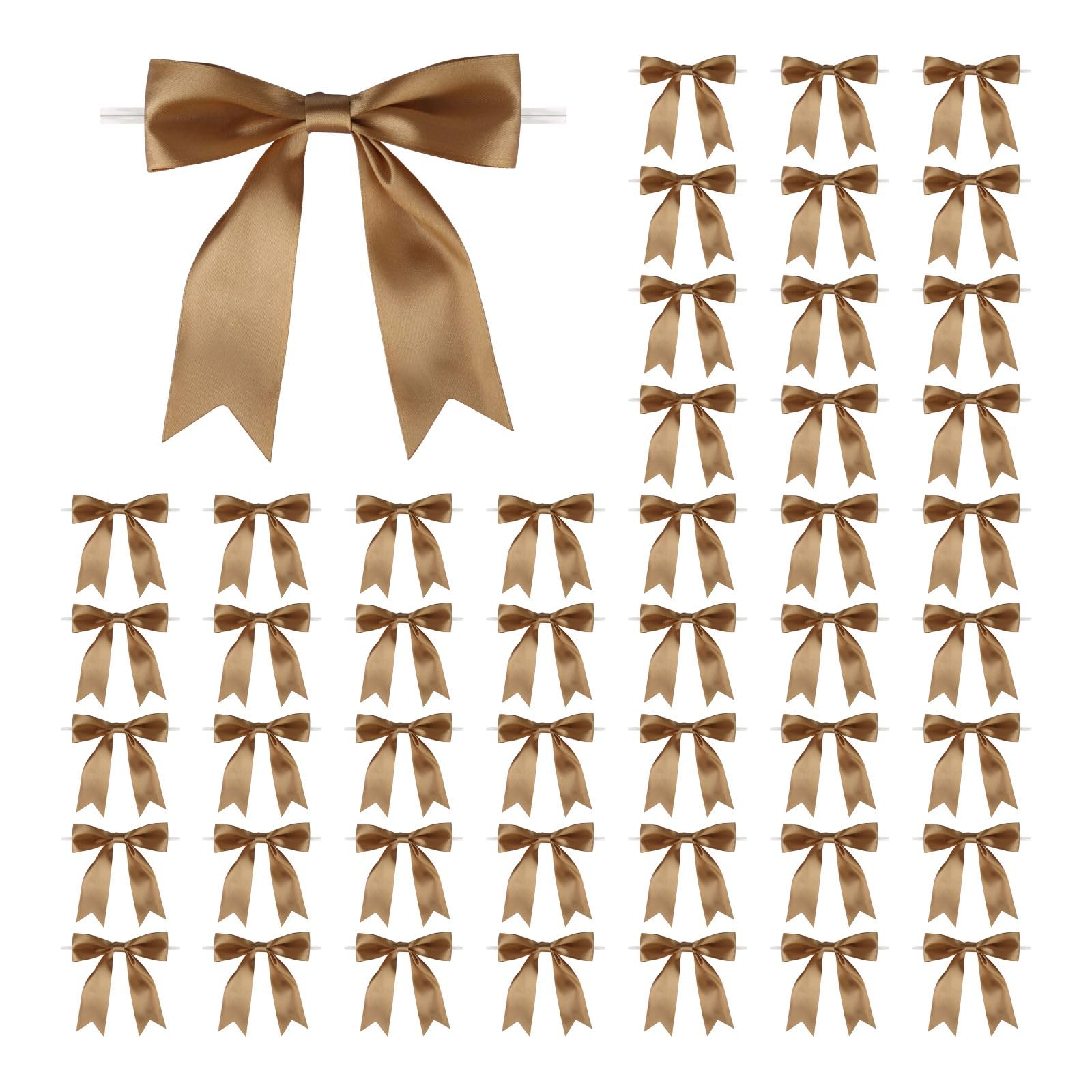 Features: Explore your imagination You can use the ribbon bows to DIY with your friends, to make some handmade crafts. You can use it to wrap gifts, parties, wreaths, cards, and so on, making them more beautiful and eye catching. Widely Applied:you can tie christmas wedding satin bows to your gifts,wreaths, windows, doors, walls, stairs, fences, fireplaces, porches, trees,this satin bow is a exquisite ornament to createa warm holiday atmosphere during the Christmas season or Wedding Party. Specifications: Material: polyester Size: 5 x 5 inches/ 12.5 x 12.5 cm Package includes:50 pieces of premade satin ribbon bows with twist tie Notes: Manual measurement, please allow slight errors on size. The color may exist a slight difference due to different screen displays. Winding risk may exist, please stay away from little kids.