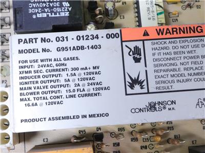 Johnson Controls 031-01234-000 Furnace Control Circuit Board G951ADB-1403