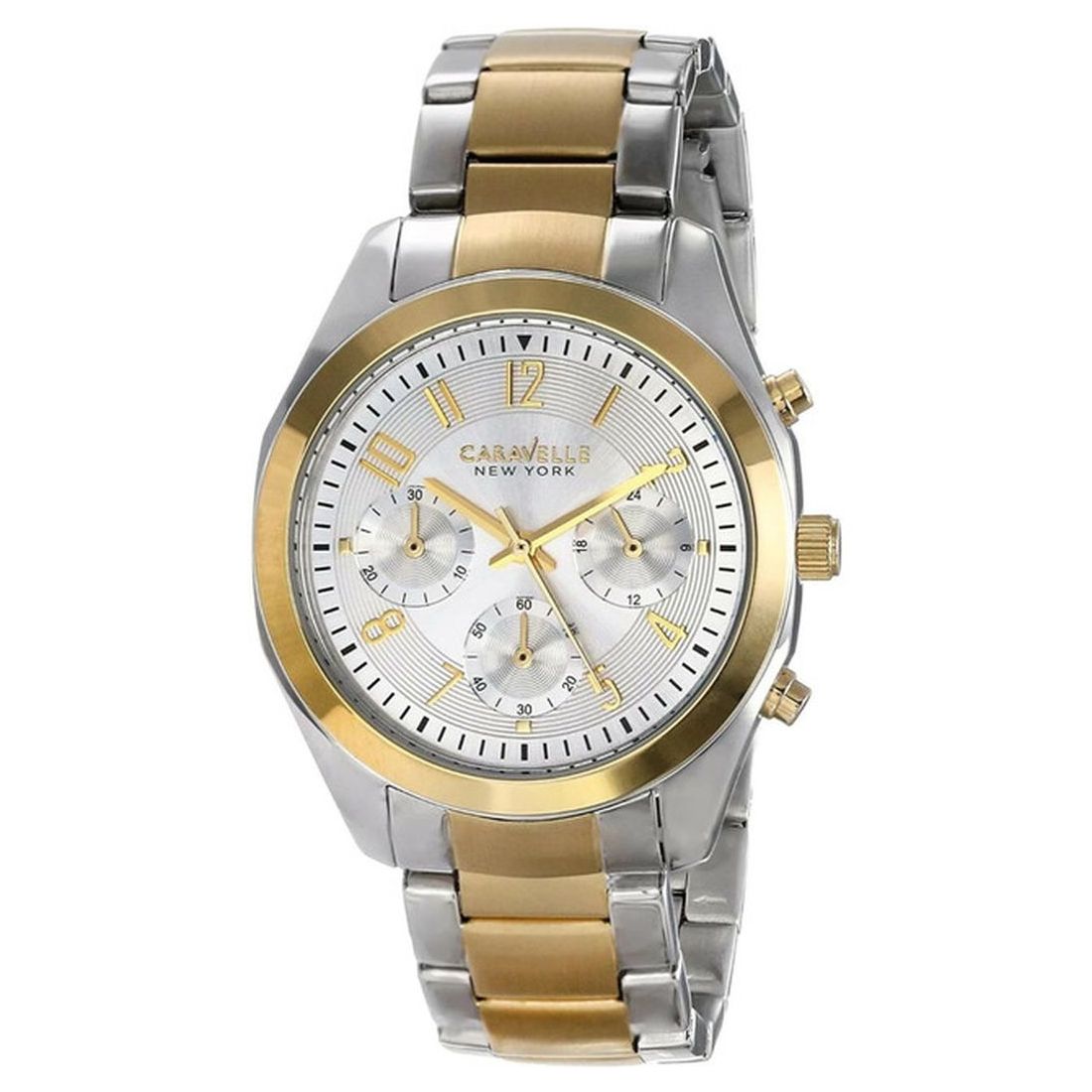 Inspired by the energy and excitement of New York City, where fashion is created every minute and the sidewalks are runways, Caravelle New York presents the newest, freshest styles, defining life in a city of limitless possibility. Designed by Bulova in the heart of Manhattan, Caravelle New York offers the latest colors and trends each season, all with the best quality at attainable prices. Caravelle New York Melissa 45L136 is an incredible trendy Ladies watch. Material of the case is Two-tone steel/gold plate while the dial color is Silver. The features of the watch include a chronograph.