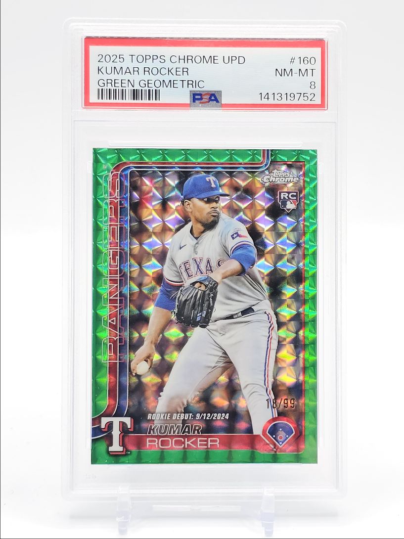 KUMAR ROCKER 2025 TOPPS CHROME ROOKIE DEBUT GREEN GEOMETRIC RC /99 PSA 8 Q1241