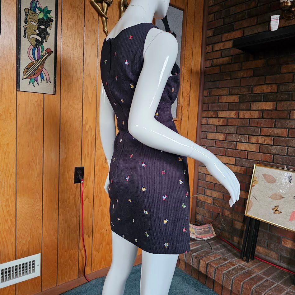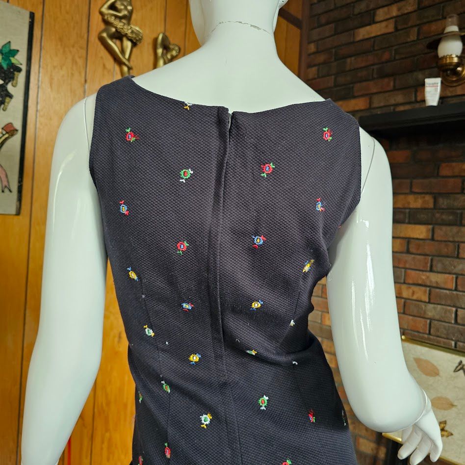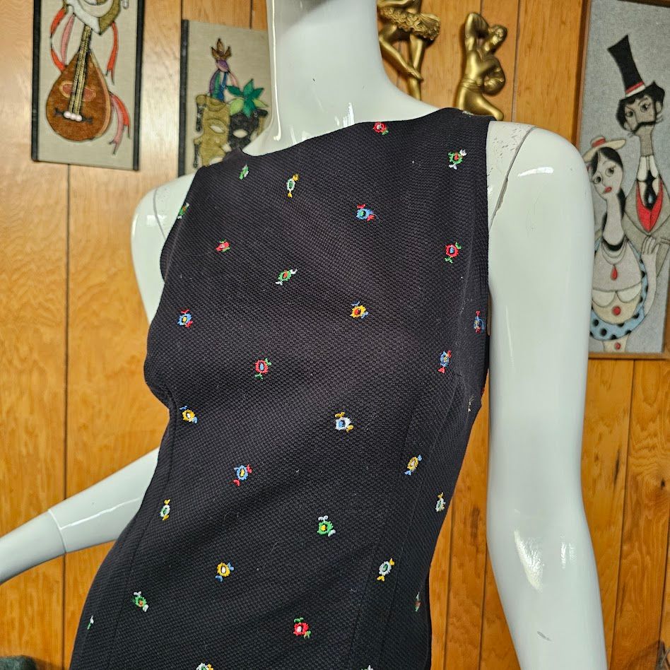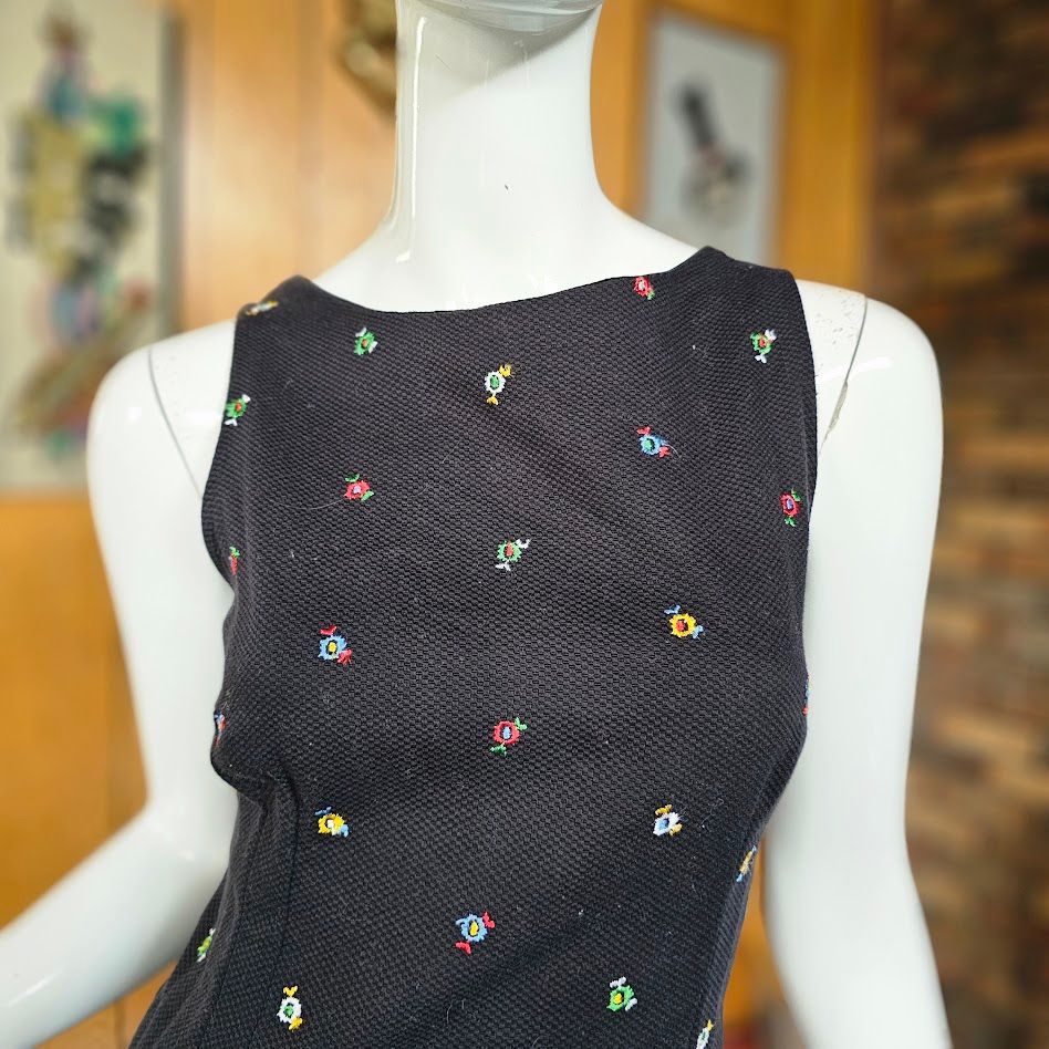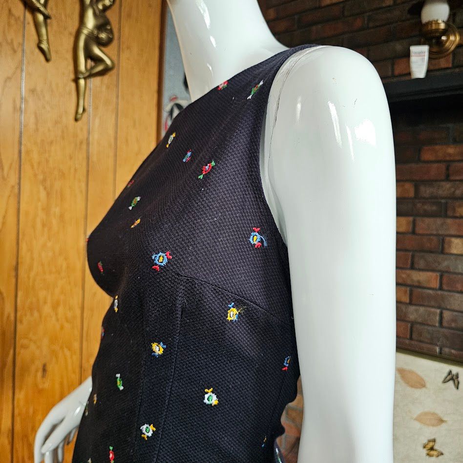 Vintage early 1980s 100% cotton dress in a midnight black. Super sweet multi-color embroidery really pops against black in a weird abstract design. Really cute sheath mini dress with longline darts to skim the body making it a flattering yet casual day dress. Closes with a nylon back zipper. Tagged a vintage 11/12 which should fit a modern M or smaller L but please check below for best fit. Material has no stretch.