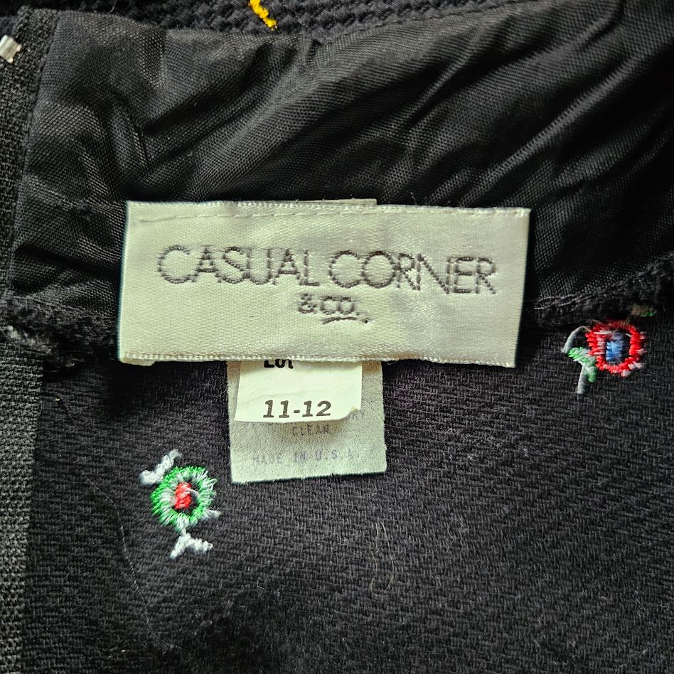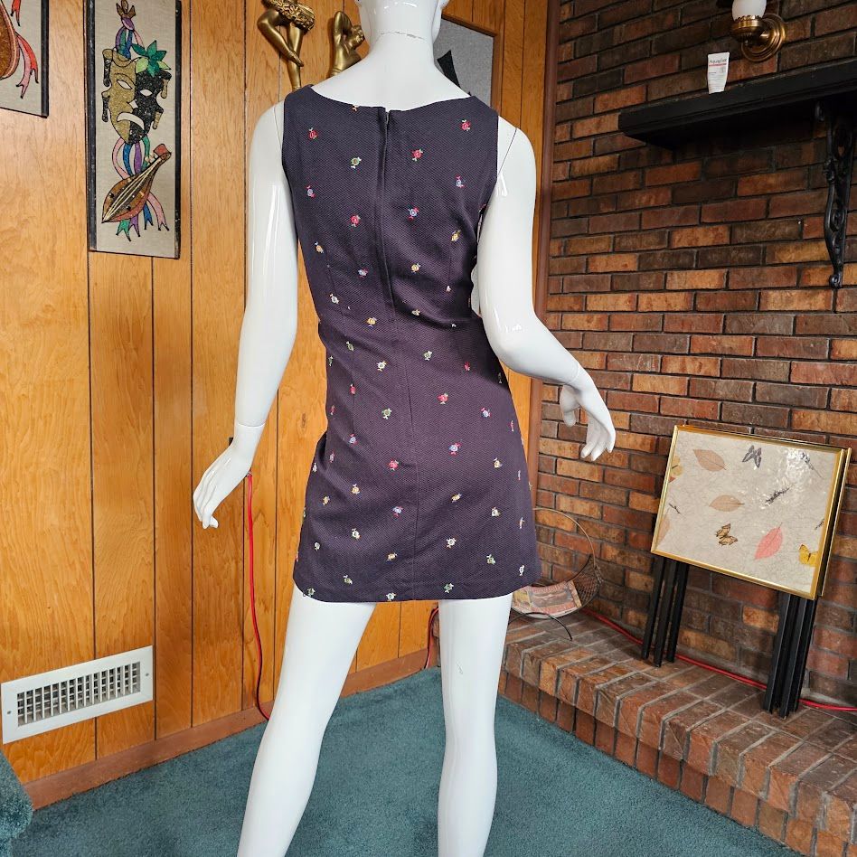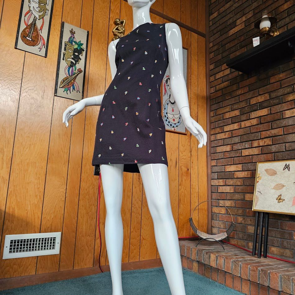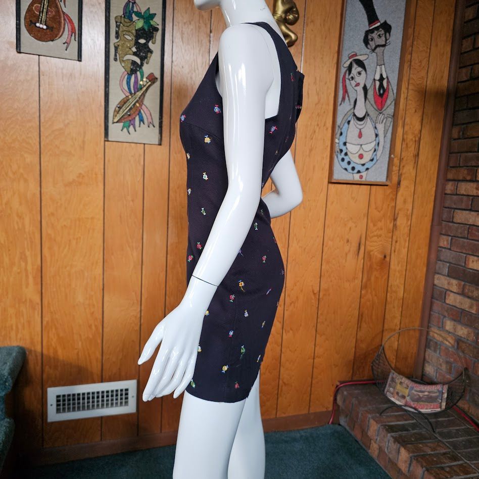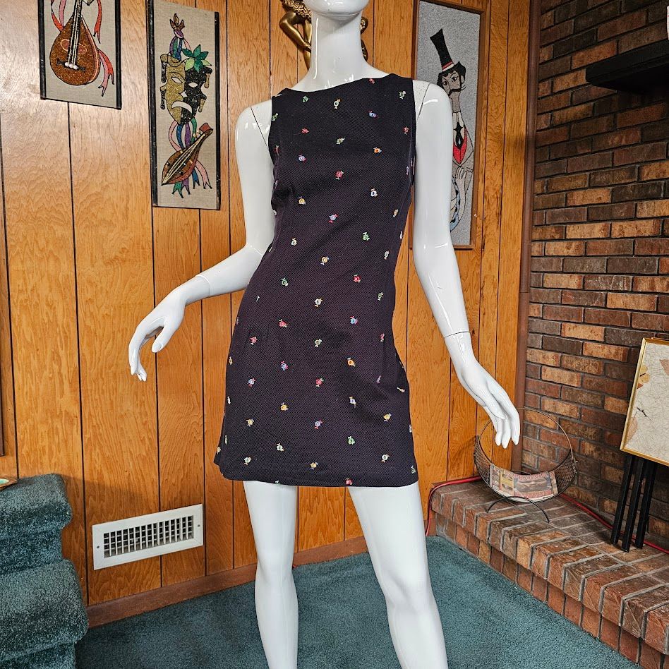 Vintage early 1980s 100% cotton dress in a midnight black. Super sweet multi-color embroidery really pops against black in a weird abstract design. Really cute sheath mini dress with longline darts to skim the body making it a flattering yet casual day dress. Closes with a nylon back zipper. Tagged a vintage 11/12 which should fit a modern M or smaller L but please check below for best fit. Material has no stretch.