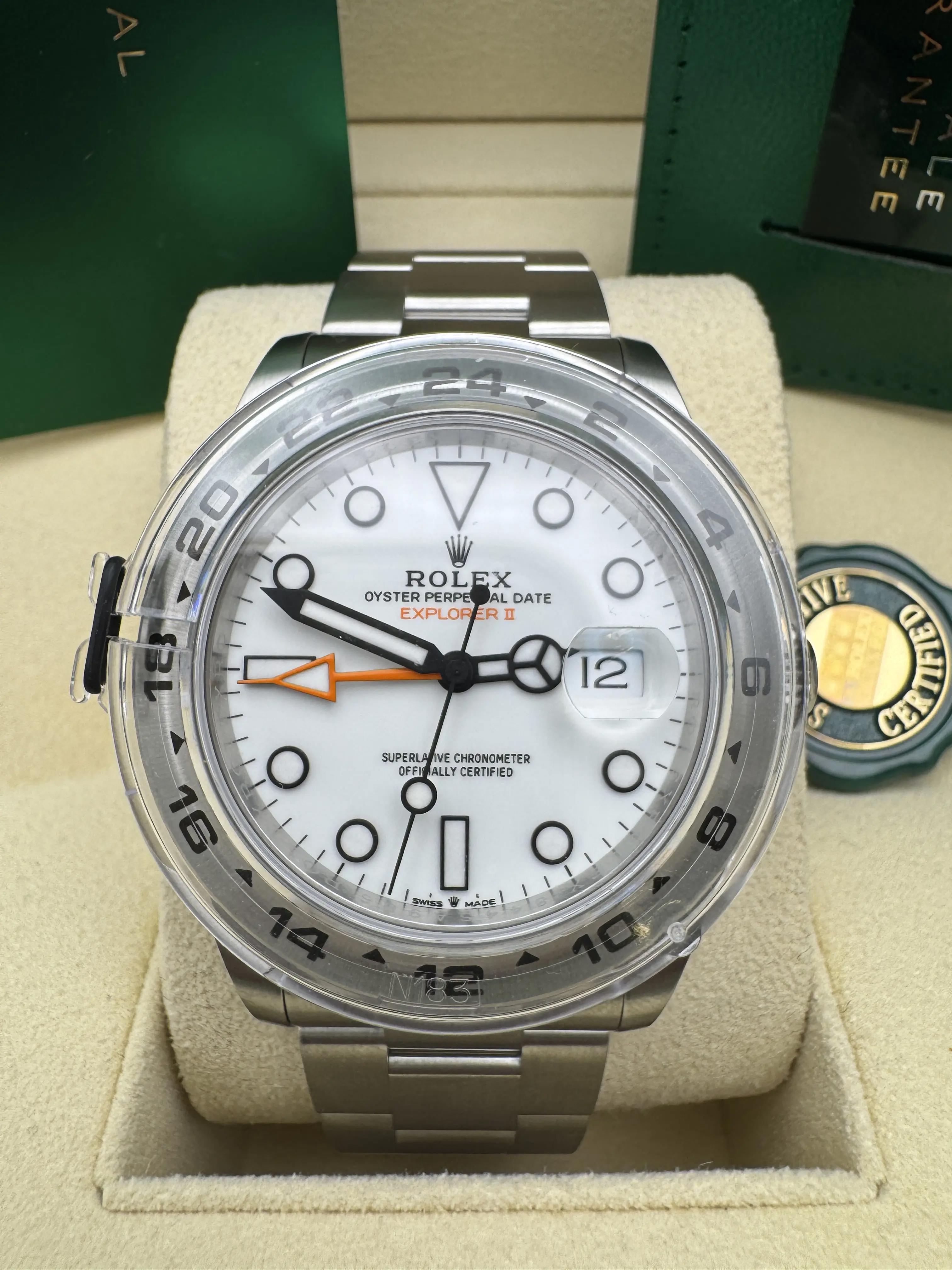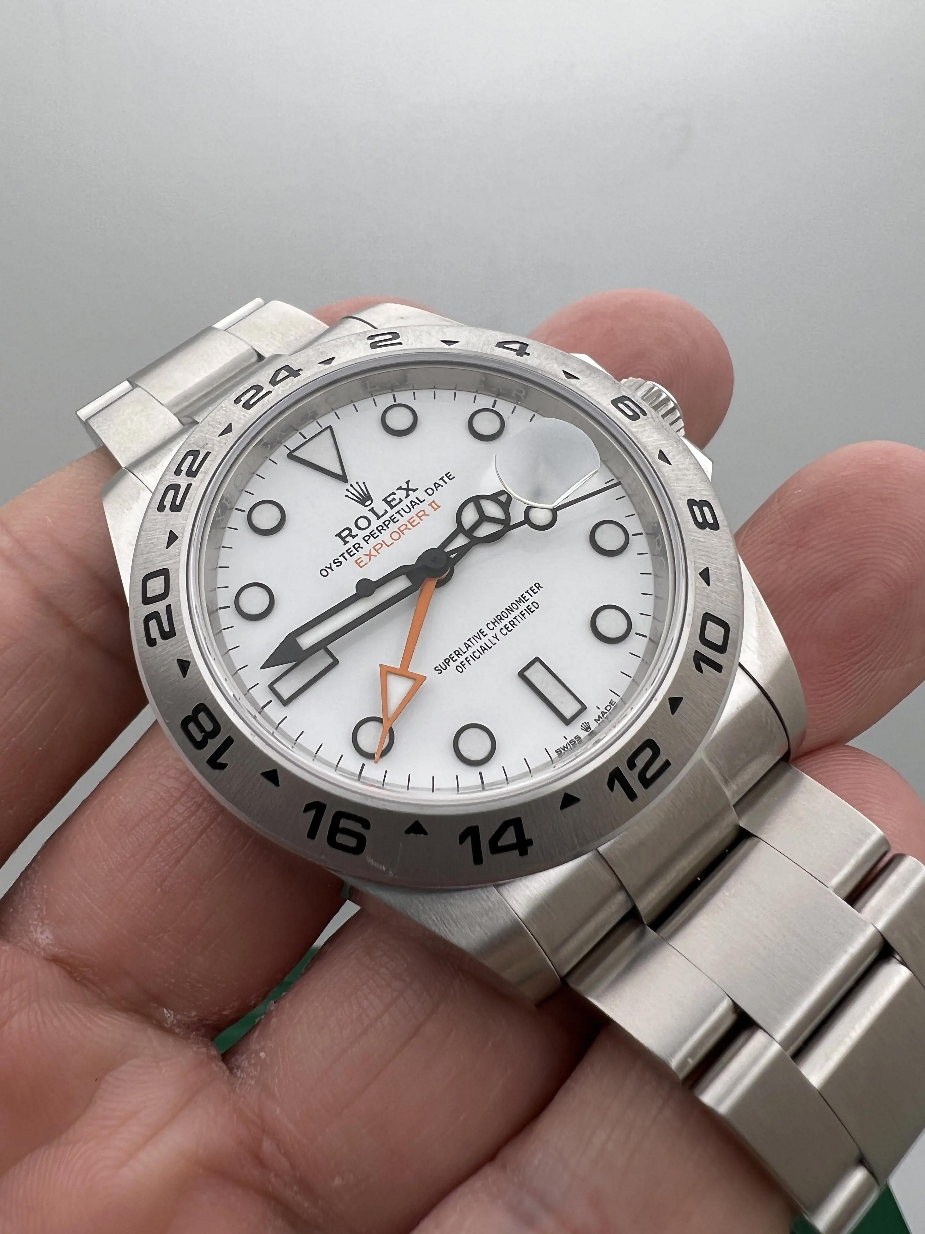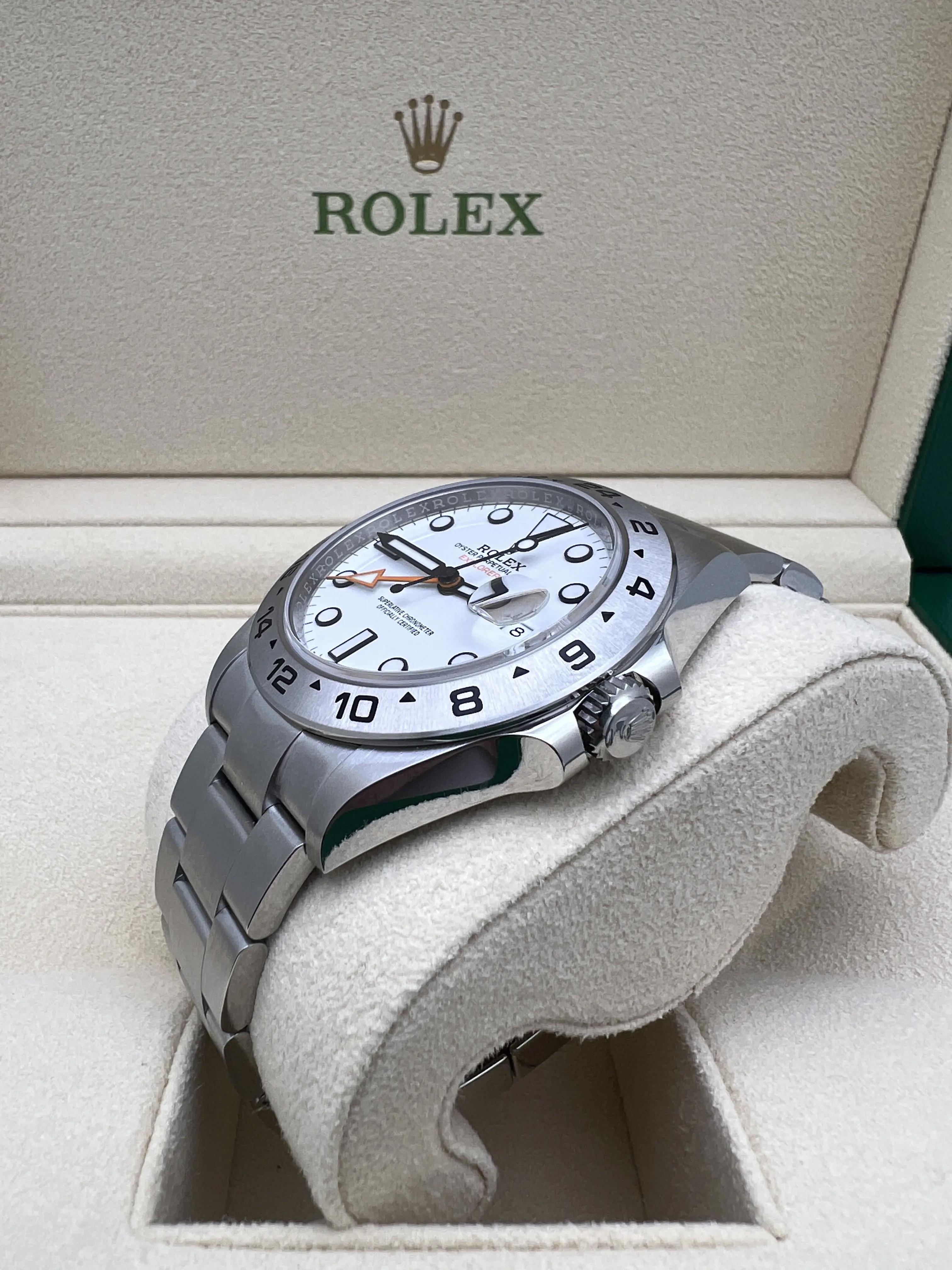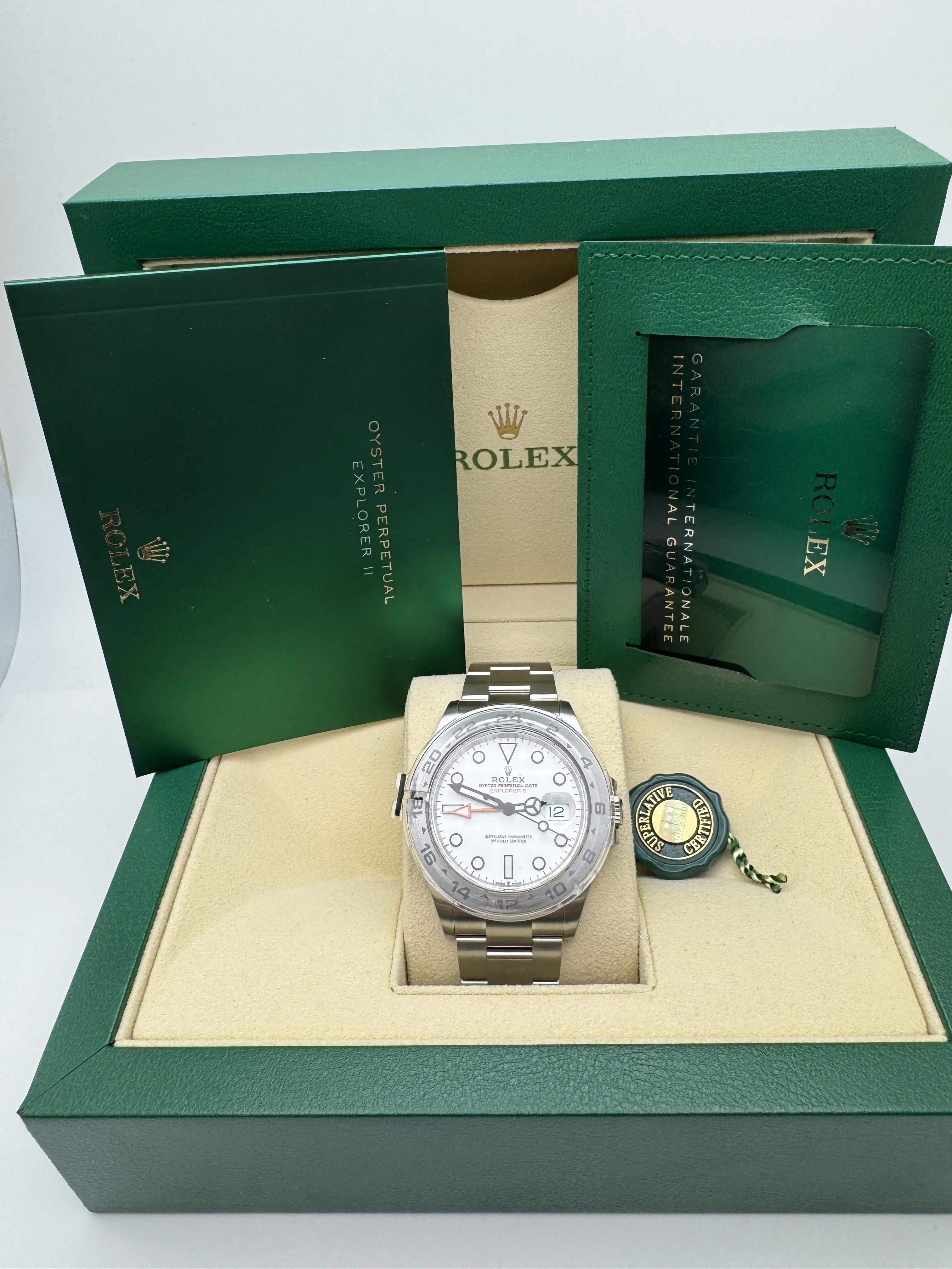 New in box Rolex Explorer II reference 226570, White "Polar" Dial. Watch comes Complete with Box, Papers, Manuals & Hangtag.