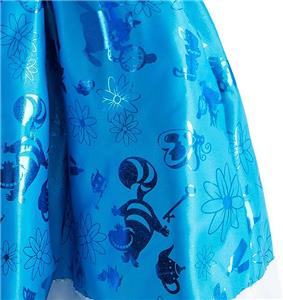 - Gathered satin skirt with stretch back/waist, along with metallic print pattern of Wonderland icons, including Cheshire Cat and White Rabbit