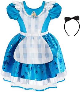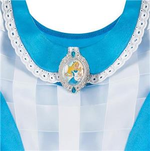 - Costume includes headband with bow and dress; Dress features satin bodice with puff sleeves, jeweled Alice cameo, and "Peter Pan" collar with fine lace trim