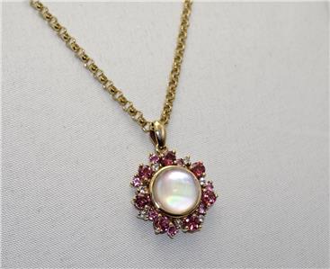 9carat 9k Yellow Gold Pink Tourmaline, Sapphire, Shell and White Topaz Pendant and 20" 9carat Gold Belcher chain