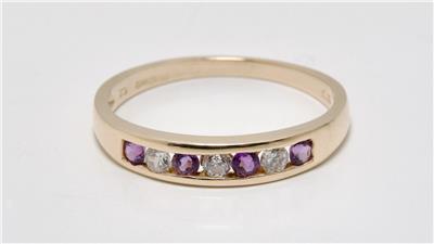 The lovely ring is set with 4 round cut natural Amethysts and 3 round cut Cubic Zirconia. All of the stones are secured in a open back channel setting.