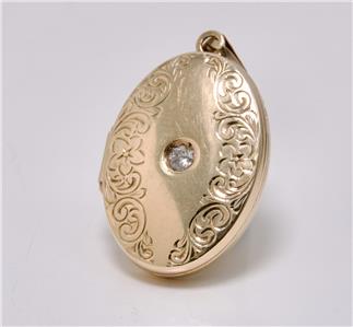 We have to offer a beautiful vintage 9carat yellow Gold locket. The front of the locket has an intricate engraved design around the outer edge of the front of the locket and a 0.10ct approx. brilliant cut Diamond is nestled in its centre.