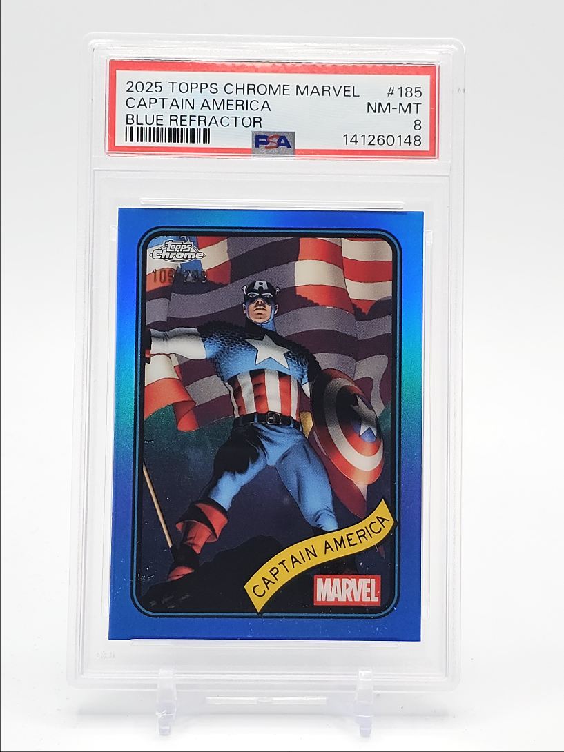 CAPTAIN AMERICA 2025 TOPPS CHROME MARVEL BLUE REFRACTOR /299 PSA 8 Q0902